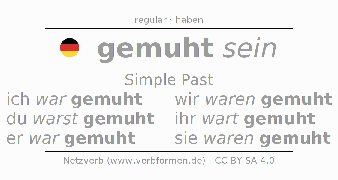 The conjugation of muhen in Imperfect Indicative Past Statal Passive is ich war gemuht, du warst gemuht, er war gemuht, wir waren gemuht, ihr wart gemuht, sie waren gemuht.The conjugation corresponds to certain grammatical rules. Likewise the requirements for the conjugation of the simple verb forms of muhen in Imperfect. Comments ☆