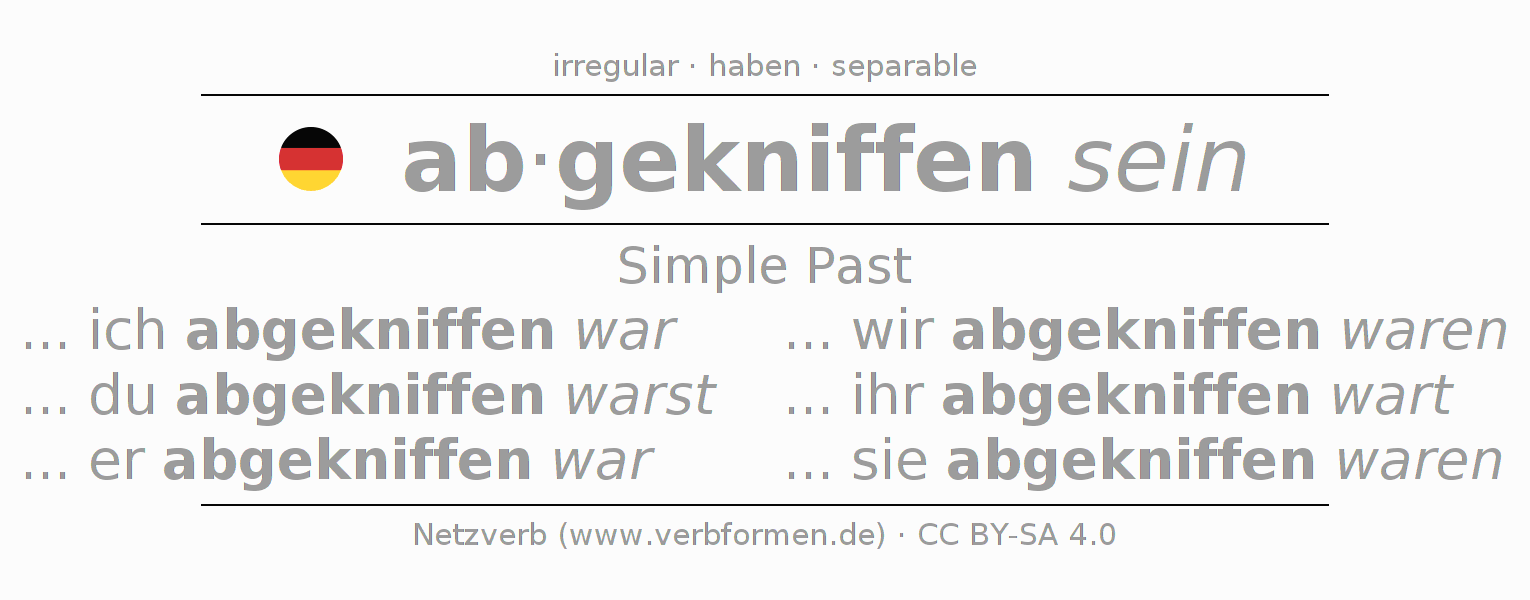 The conjugation of abkneifen in Imperfect Indicative Past Statal Passive is ... ich abgekniffen war, ... du abgekniffen warst, ... er abgekniffen war, ... wir abgekniffen waren, ... ihr abgekniffen wart, ... sie abgekniffen waren.The conjugation corresponds to certain grammatical rules. Likewise the requirements for the conjugation of the simple verb forms of abkneifen in Imperfect. Comments ☆