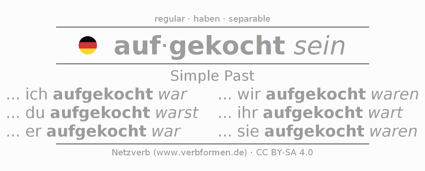 The conjugation of aufkochen in Imperfect Indicative Past Statal Passive is ... ich aufgekocht war, ... du aufgekocht warst, ... er aufgekocht war, ... wir aufgekocht waren, ... ihr aufgekocht wart, ... sie aufgekocht waren.The conjugation corresponds to certain grammatical rules. Likewise the requirements for the conjugation of the simple verb forms of aufkochen in Imperfect. Comments ☆