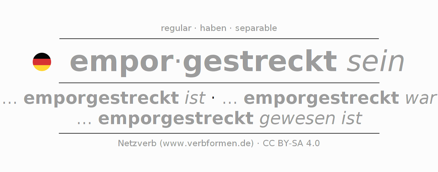The conjugation of emporstrecken in Imperfect Indicative Past Statal Passive is ... ich emporgestreckt war, ... du emporgestreckt warst, ... er emporgestreckt war, ... wir emporgestreckt waren, ... ihr emporgestreckt wart, ... sie emporgestreckt waren.The conjugation corresponds to certain grammatical rules. Likewise the requirements for the conjugation of the simple verb forms of emporstrecken in Imperfect. Comments ☆