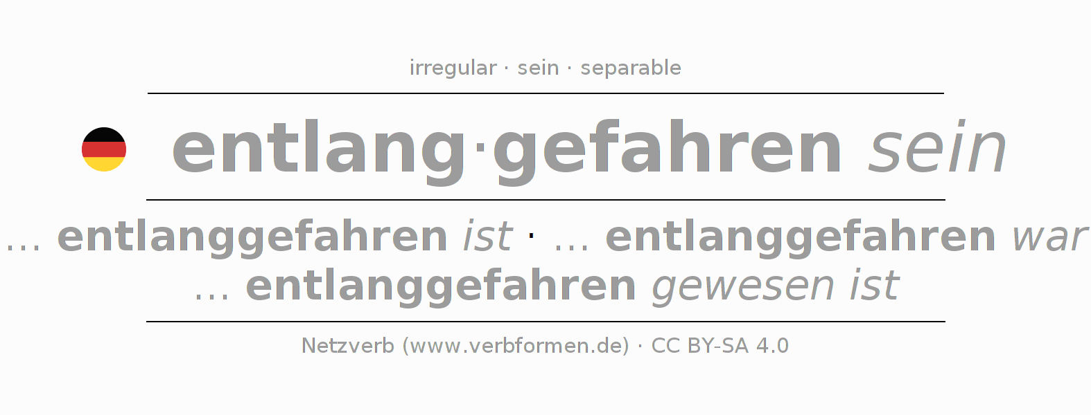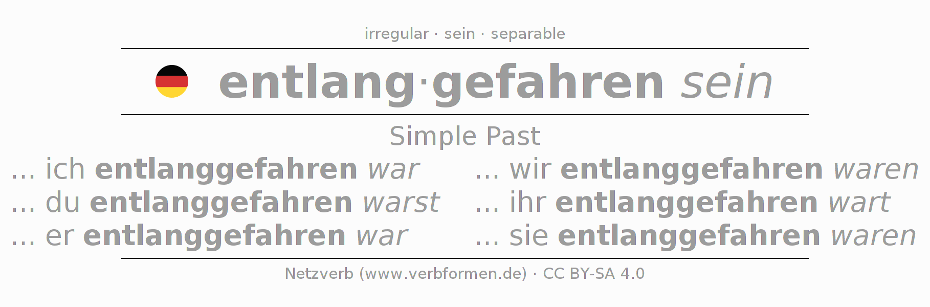 The conjugation of entlangfahren in Imperfect Indicative Past Statal Passive is ... ich entlanggefahren war, ... du entlanggefahren warst, ... er entlanggefahren war, ... wir entlanggefahren waren, ... ihr entlanggefahren wart, ... sie entlanggefahren waren.The conjugation corresponds to certain grammatical rules. Likewise the requirements for the conjugation of the simple verb forms of entlangfahren in Imperfect. Comments ☆