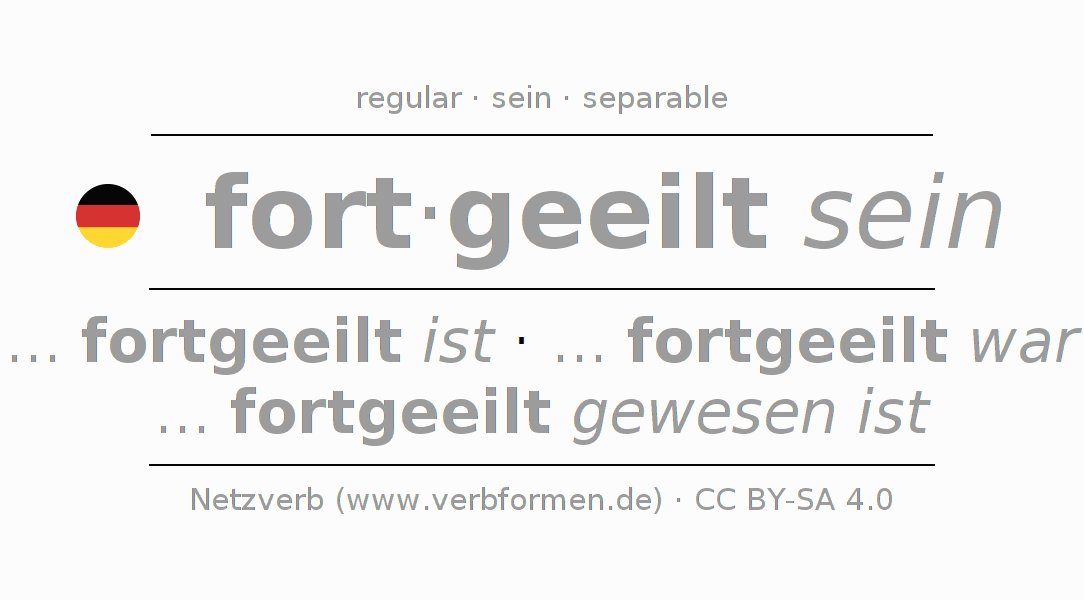 The conjugation of forteilen in Imperfect Indicative Past Statal Passive is ... ich fortgeeilt war, ... du fortgeeilt warst, ... er fortgeeilt war, ... wir fortgeeilt waren, ... ihr fortgeeilt wart, ... sie fortgeeilt waren.The conjugation corresponds to certain grammatical rules. Likewise the requirements for the conjugation of the simple verb forms of forteilen in Imperfect. Comments ☆