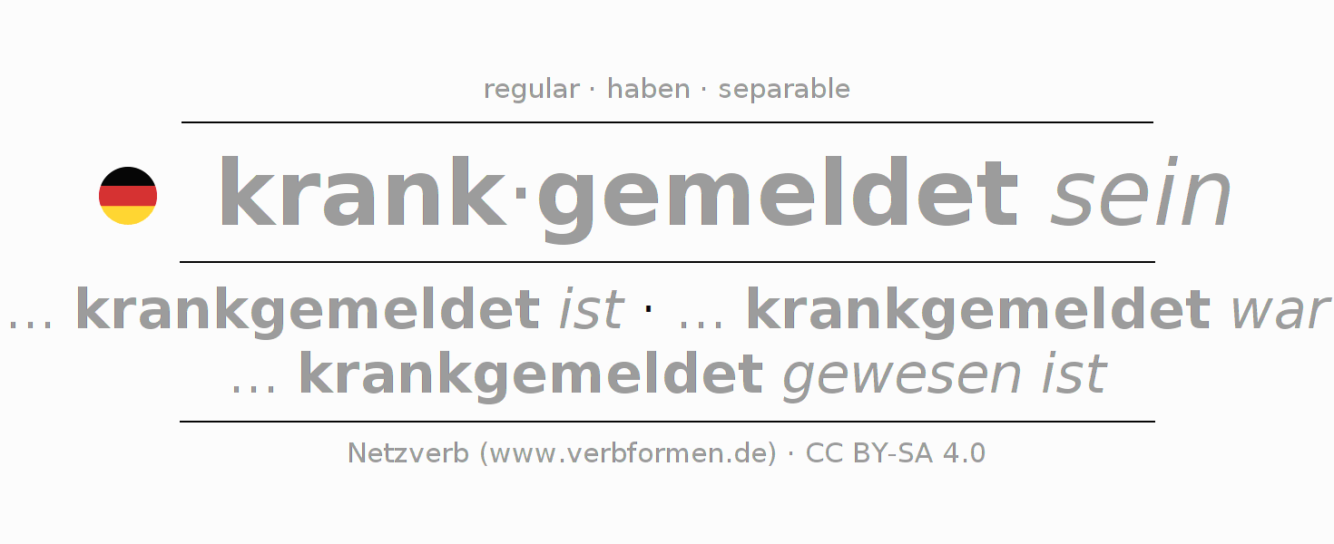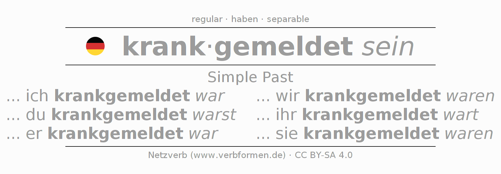 The conjugation of krankmelden in Imperfect Indicative Past Statal Passive is ... ich krankgemeldet war, ... du krankgemeldet warst, ... er krankgemeldet war, ... wir krankgemeldet waren, ... ihr krankgemeldet wart, ... sie krankgemeldet waren.The conjugation corresponds to certain grammatical rules. Likewise the requirements for the conjugation of the simple verb forms of krankmelden in Imperfect. Comments ☆