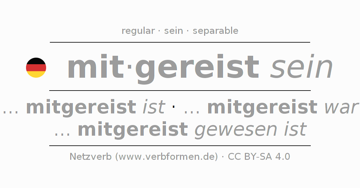 The conjugation of mitreisen in Imperfect Indicative Past Statal Passive is ... ich mitgereist war, ... du mitgereist warst, ... er mitgereist war, ... wir mitgereist waren, ... ihr mitgereist wart, ... sie mitgereist waren.The conjugation corresponds to certain grammatical rules. Likewise the requirements for the conjugation of the simple verb forms of mitreisen in Imperfect. Comments ☆