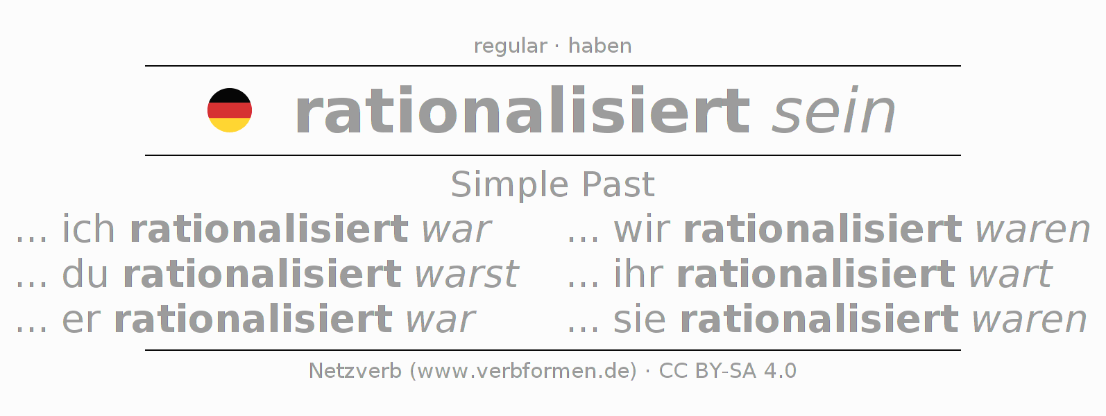 The conjugation of rationalisieren in Imperfect Indicative Past Statal Passive is ... ich rationalisiert war, ... du rationalisiert warst, ... er rationalisiert war, ... wir rationalisiert waren, ... ihr rationalisiert wart, ... sie rationalisiert waren.The conjugation corresponds to certain grammatical rules. Likewise the requirements for the conjugation of the simple verb forms of rationalisieren in Imperfect. Comments ☆