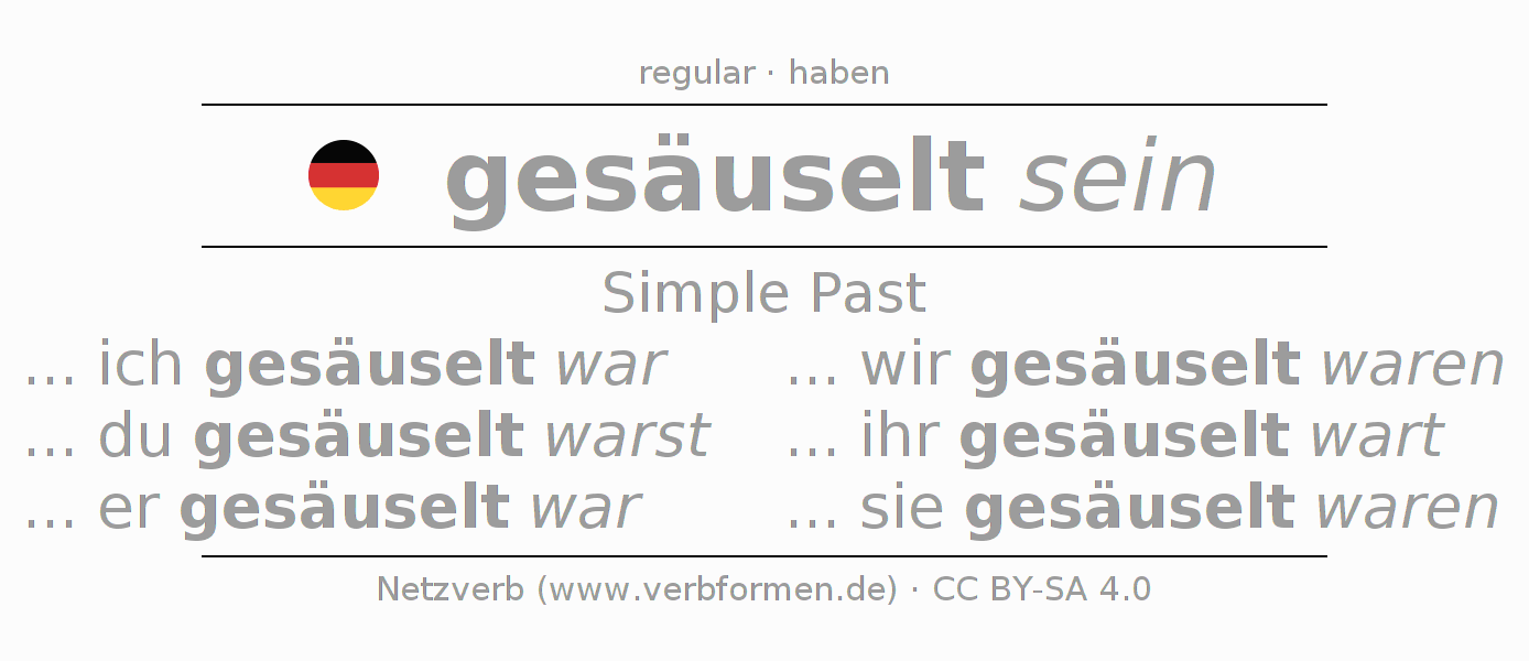 The conjugation of säuseln in Imperfect Indicative Past Statal Passive is ... ich gesäuselt war, ... du gesäuselt warst, ... er gesäuselt war, ... wir gesäuselt waren, ... ihr gesäuselt wart, ... sie gesäuselt waren.The conjugation corresponds to certain grammatical rules. Likewise the requirements for the conjugation of the simple verb forms of säuseln in Imperfect. Comments ☆