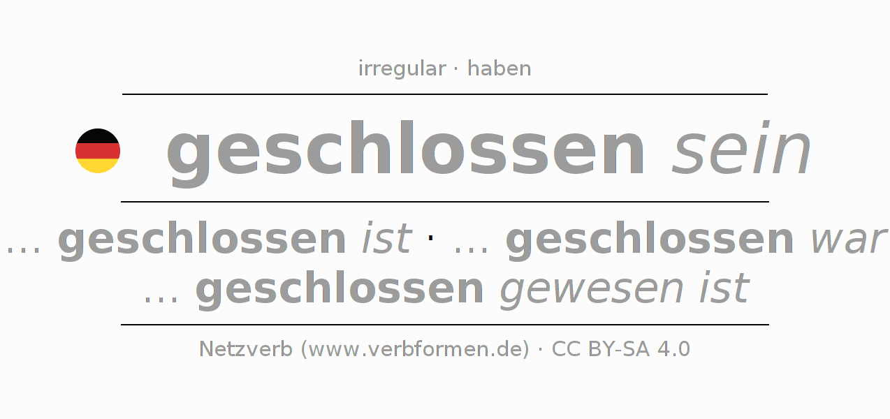 The conjugation of schließen in Imperfect Indicative Past Statal Passive is ... ich geschlossen war, ... du geschlossen warst, ... er geschlossen war, ... wir geschlossen waren, ... ihr geschlossen wart, ... sie geschlossen waren.The conjugation corresponds to certain grammatical rules. Likewise the requirements for the conjugation of the simple verb forms of schließen in Imperfect. Comments ☆