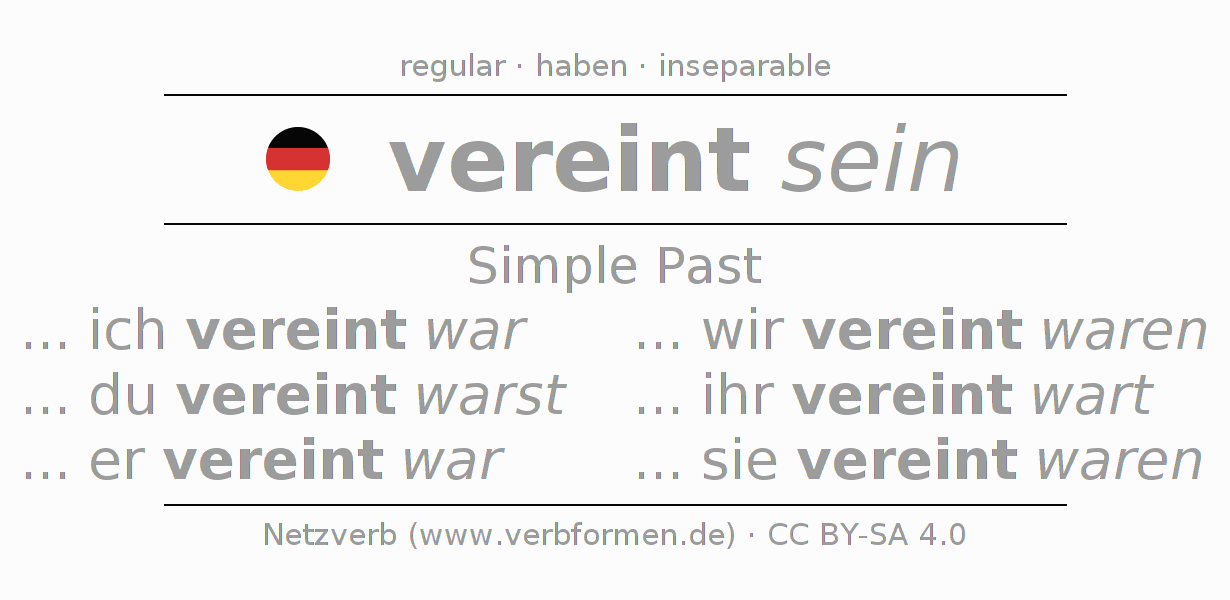 The conjugation of vereinen in Imperfect Indicative Past Statal Passive is ... ich vereint war, ... du vereint warst, ... er vereint war, ... wir vereint waren, ... ihr vereint wart, ... sie vereint waren.The conjugation corresponds to certain grammatical rules. Likewise the requirements for the conjugation of the simple verb forms of vereinen in Imperfect. Comments ☆