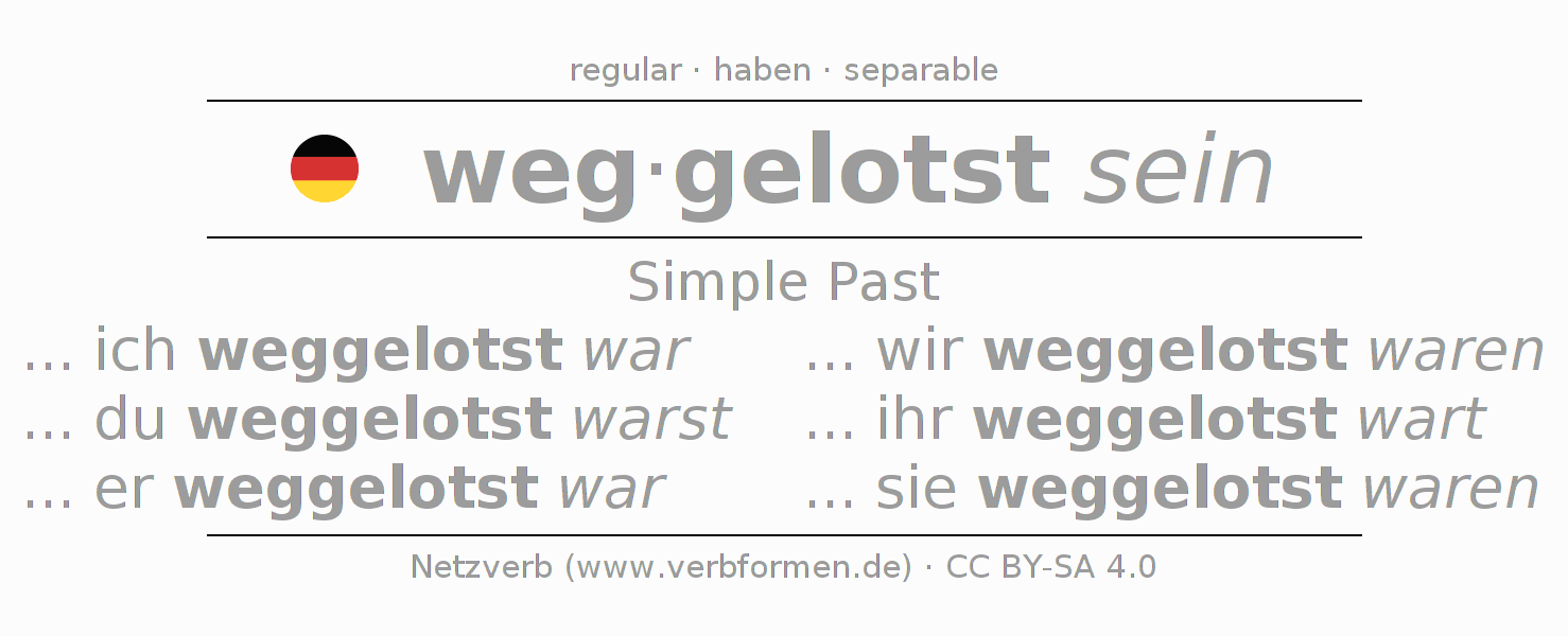 The conjugation of weglotsen in Imperfect Indicative Past Statal Passive is ... ich weggelotst war, ... du weggelotst warst, ... er weggelotst war, ... wir weggelotst waren, ... ihr weggelotst wart, ... sie weggelotst waren.The conjugation corresponds to certain grammatical rules. Likewise the requirements for the conjugation of the simple verb forms of weglotsen in Imperfect. Comments ☆