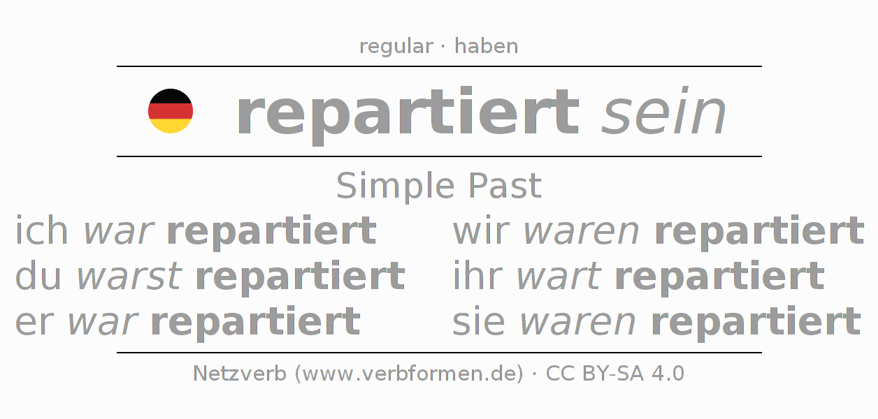 The conjugation of repartieren in Imperfect Indicative Past Statal Passive is ich war repartiert, du warst repartiert, er war repartiert, wir waren repartiert, ihr wart repartiert, sie waren repartiert.The conjugation corresponds to certain grammatical rules. Likewise the requirements for the conjugation of the simple verb forms of repartieren in Imperfect. Comments ☆