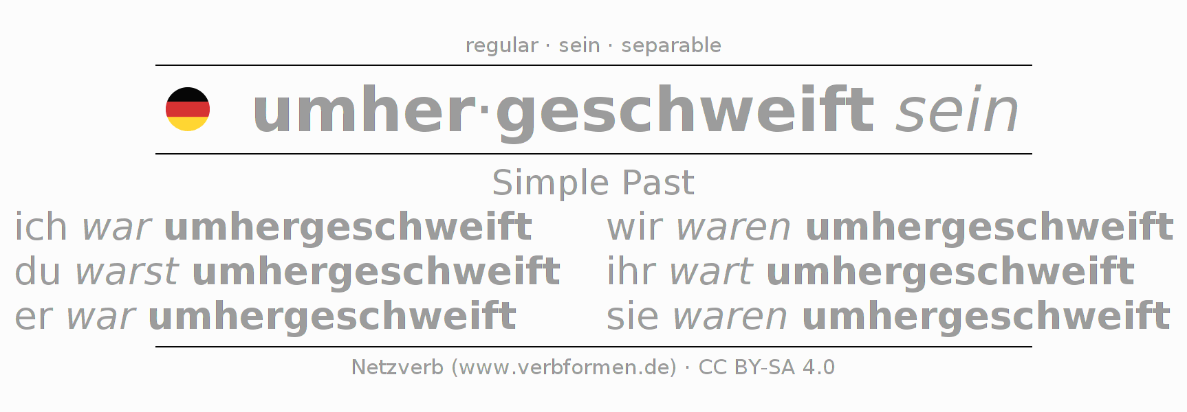 The conjugation of umherschweifen in Imperfect Indicative Past Statal Passive is ich war umhergeschweift, du warst umhergeschweift, er war umhergeschweift, wir waren umhergeschweift, ihr wart umhergeschweift, sie waren umhergeschweift.The conjugation corresponds to certain grammatical rules. Likewise the requirements for the conjugation of the simple verb forms of umherschweifen in Imperfect. Comments ☆