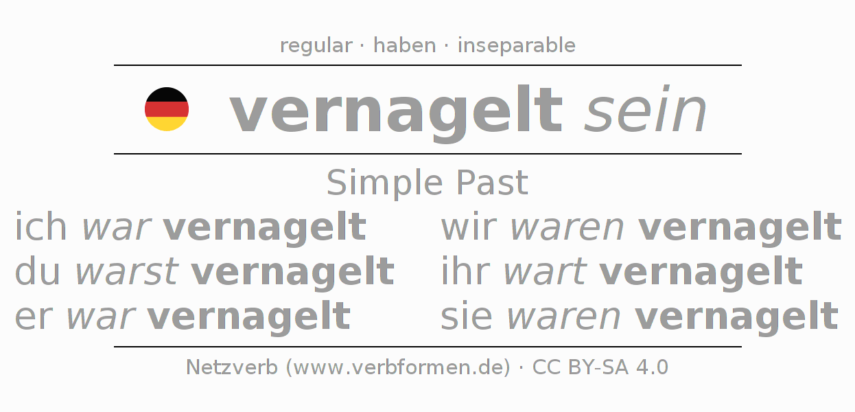 The conjugation of vernageln in Imperfect Indicative Past Statal Passive is ich war vernagelt, du warst vernagelt, er war vernagelt, wir waren vernagelt, ihr wart vernagelt, sie waren vernagelt.The conjugation corresponds to certain grammatical rules. Likewise the requirements for the conjugation of the simple verb forms of vernageln in Imperfect. Comments ☆