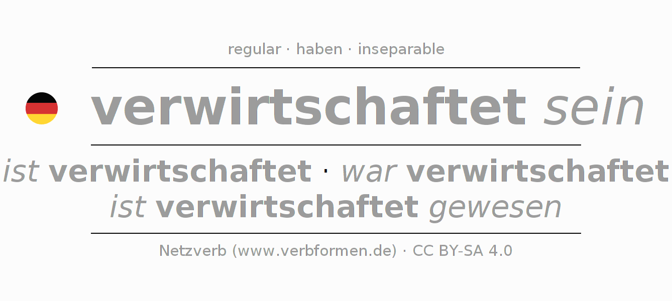 The conjugation of verwirtschaften in Imperfect Indicative Past Statal Passive is ich war verwirtschaftet, du warst verwirtschaftet, er war verwirtschaftet, wir waren verwirtschaftet, ihr wart verwirtschaftet, sie waren verwirtschaftet.The conjugation corresponds to certain grammatical rules. Likewise the requirements for the conjugation of the simple verb forms of verwirtschaften in Imperfect. Comments ☆