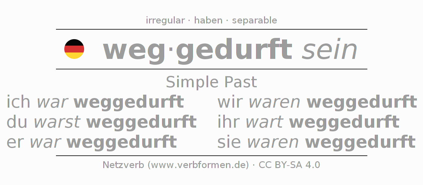 The conjugation of wegdürfen in Imperfect Indicative Past Statal Passive is ich war weggedurft, du warst weggedurft, er war weggedurft, wir waren weggedurft, ihr wart weggedurft, sie waren weggedurft.The conjugation corresponds to certain grammatical rules. Likewise the requirements for the conjugation of the simple verb forms of wegdürfen in Imperfect. Comments ☆