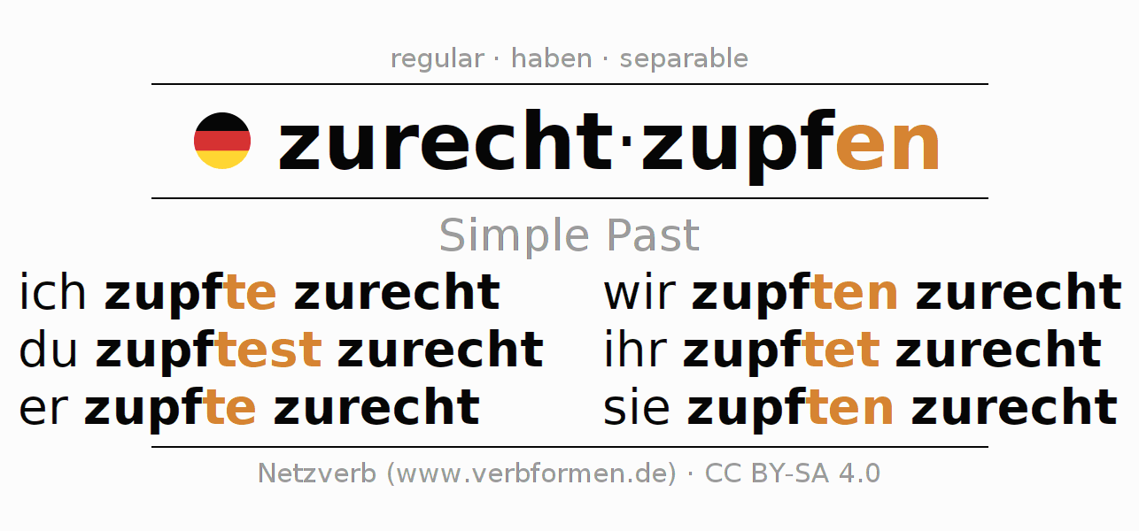 The conjugation of zurechtzupfen (adjust, arrange) in the past tense is ich zupfte zurecht, du zupftest zurecht, er zupfte zurecht, wir zupften zurecht, ihr zupftet zurecht, sie zupften zurecht. As a regular verb the unmodified stem zupf- is used. The preterite endings -te, -test, -te, -ten, -tet, -ten are appended to this stem.The prefix zurecht- of zurechtzupfen is separated.The conjugation of these forms conforms to the grammatical rules for verbs in the past tense. Comments ☆