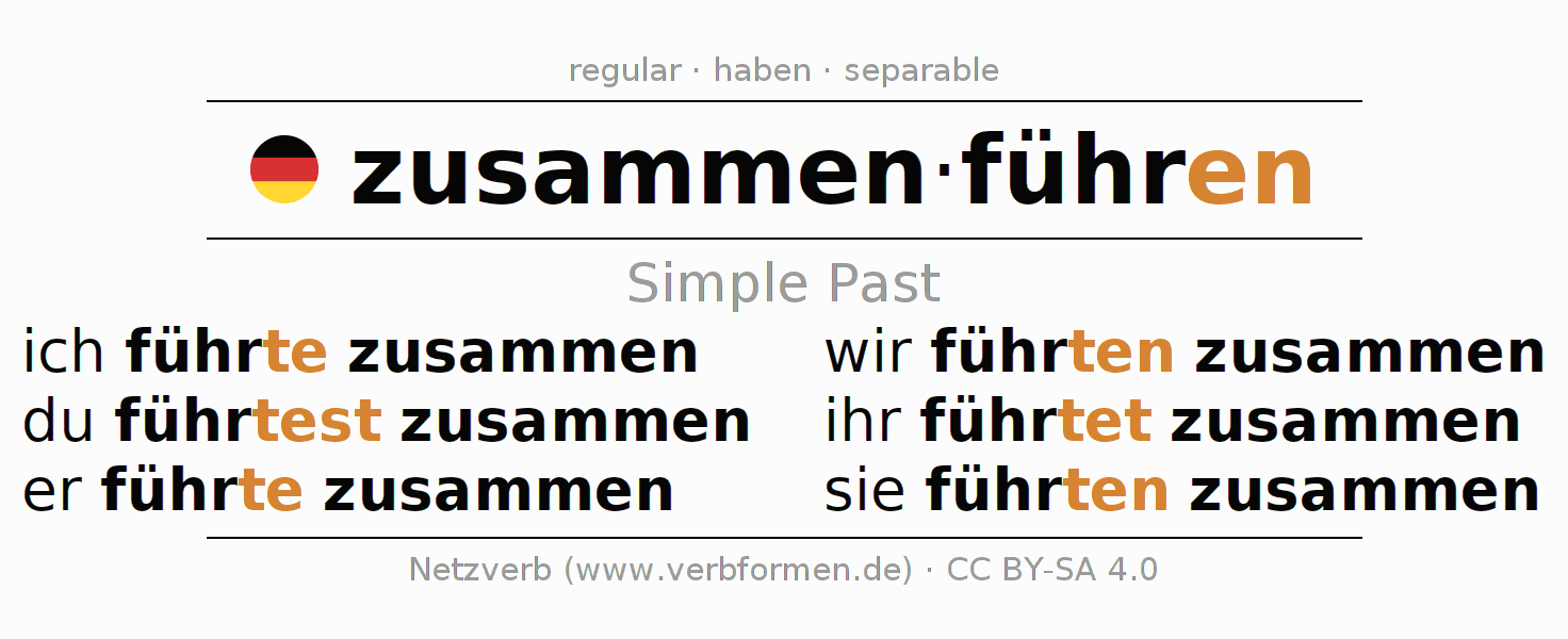 The conjugation of zusammenführen (bring together, consolidate) in the past tense is ich führte zusammen, du führtest zusammen, er führte zusammen, wir führten zusammen, ihr führtet zusammen, sie führten zusammen. As a regular verb the unmodified stem führ- is used. The preterite endings -te, -test, -te, -ten, -tet, -ten are appended to this stem.The prefix zusammen- of zusammenführen is separated.The conjugation of these forms conforms to the grammatical rules for verbs in the past tense. Comments ☆