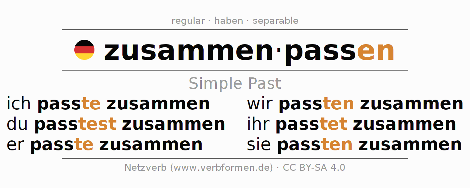 The conjugation of zusammenpassen (fit together, go together) in the past tense is ich passte zusammen, du passtest zusammen, er passte zusammen, wir passten zusammen, ihr passtet zusammen, sie passten zusammen. As a regular verb the unmodified stem pass- is used. The preterite endings -te, -test, -te, -ten, -tet, -ten are appended to this stem.The prefix zusammen- of zusammenpassen is separated.The conjugation of these forms conforms to the grammatical rules for verbs in the past tense. Comments ☆