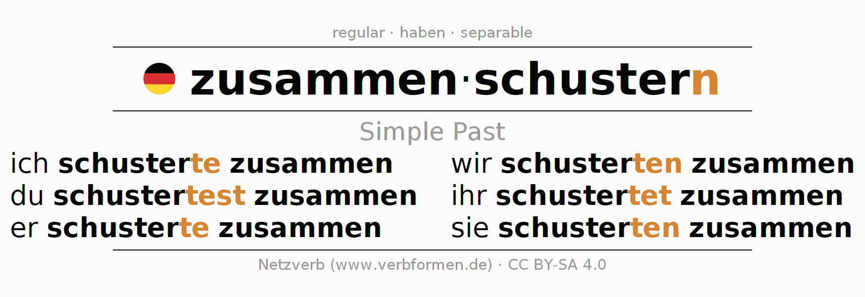 The conjugation of zusammenschustern (duct-tape together, throw together) in the past tense is ich schusterte zusammen, du schustertest zusammen, er schusterte zusammen, wir schusterten zusammen, ihr schustertet zusammen, sie schusterten zusammen. As a regular verb the unmodified stem schuster- is used. The preterite endings -te, -test, -te, -ten, -tet, -ten are appended to this stem.The prefix zusammen- of zusammenschustern is separated.The conjugation of these forms conforms to the grammatical rules for verbs in the past tense. Comments ☆