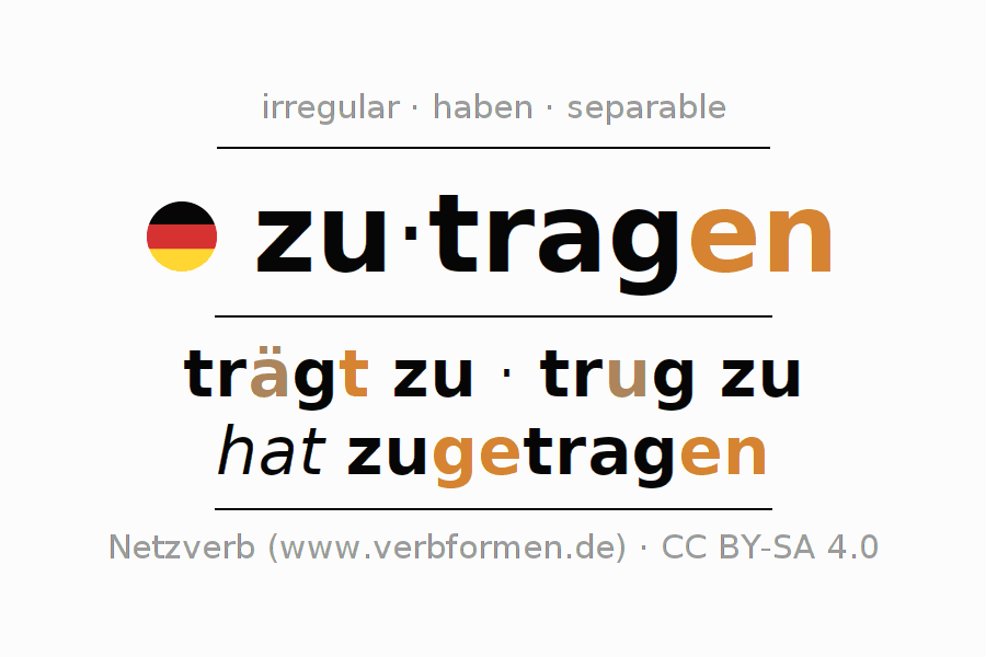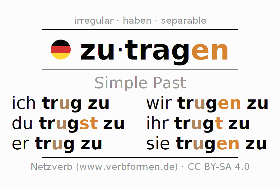 The conjugation of zutragen (befall, bechance) in the past tense is ich trug zu, du trugst zu, er trug zu, wir trugen zu, ihr trugt zu, sie trugen zu. As an irregular, strong verb with ablaut -u- the preterite stem trug- is used. The preterite endings -st, -en, -t, -en are appended to this stem. The 1st and 3rd person singular have no endings.The prefix zu- of zutragen is separated.The conjugation of these forms conforms to the grammatical rules for verbs in the past tense. Comments ☆