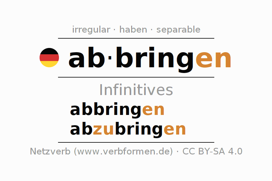 The infinitives of abbringen (dissuade, remove) are: abbringen, abzubringen. The ending -en is appended to the verb stem bring. When forming the infinitive with zu the "zu" is inserted after the separable first part ab-. The formation of the forms corresponds to the grammatical rules for the conjugation of verbs in the infinitive. Comments ☆