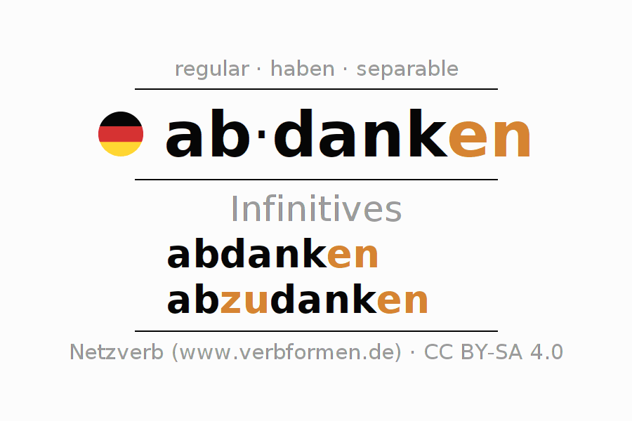 The infinitives of abdanken (abdicate, resign) are: abdanken, abzudanken. The ending -en is appended to the verb stem dank. When forming the infinitive with zu the "zu" is inserted after the separable first part ab-. The formation of the forms corresponds to the grammatical rules for the conjugation of verbs in the infinitive. Comments ☆