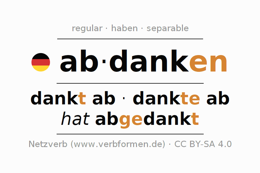 The verb abdanken fully conjugated in all persons and numbers in the Infinitive Present Perfect