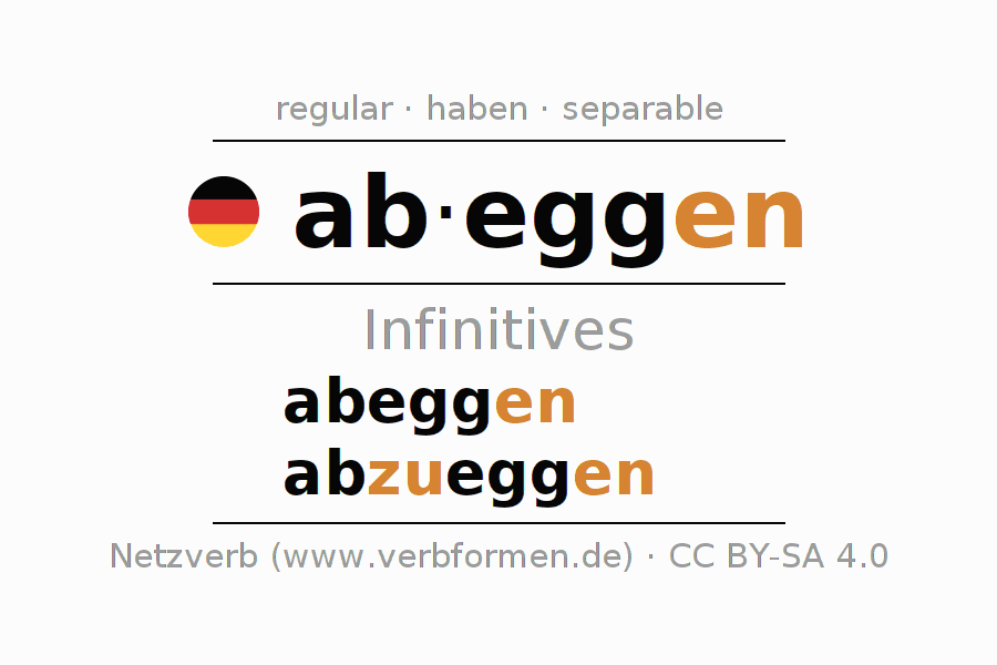 The infinitives of abeggen (harrow) are: abeggen, abzueggen. The ending -en is appended to the verb stem egg. When forming the infinitive with zu the "zu" is inserted after the separable first part ab-. The formation of the forms corresponds to the grammatical rules for the conjugation of verbs in the infinitive. Comments ☆