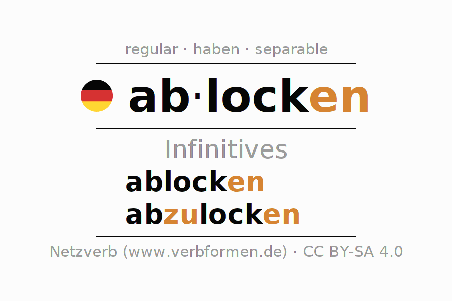 The infinitives of ablocken (coax (from), coax out of) are: ablocken, abzulocken. The ending -en is appended to the verb stem lock. When forming the infinitive with zu the "zu" is inserted after the separable first part ab-. The formation of the forms corresponds to the grammatical rules for the conjugation of verbs in the infinitive. Comments ☆