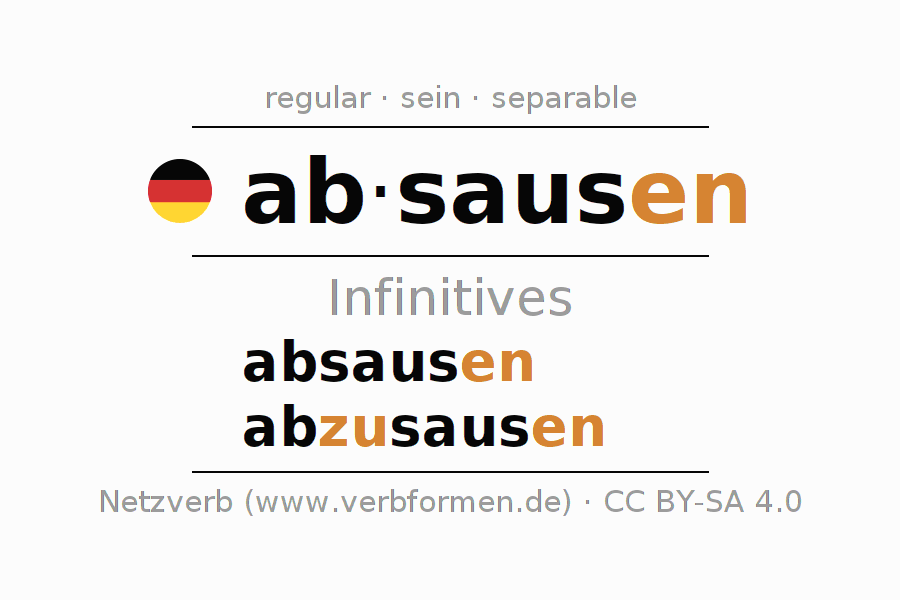 The infinitives of absausen (dash away, take off) are: absausen, abzusausen. The ending -en is appended to the verb stem saus. When forming the infinitive with zu the "zu" is inserted after the separable first part ab-. The formation of the forms corresponds to the grammatical rules for the conjugation of verbs in the infinitive. Comments ☆