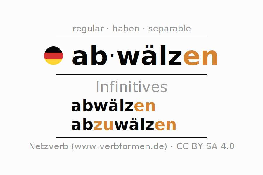 The infinitives of abwälzen (pass on, shift) are: abwälzen, abzuwälzen. The ending -en is appended to the verb stem wälz. When forming the infinitive with zu the "zu" is inserted after the separable first part ab-. The formation of the forms corresponds to the grammatical rules for the conjugation of verbs in the infinitive. Comments ☆