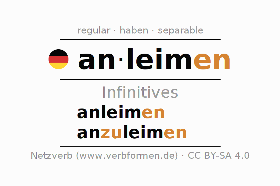 The infinitives of anleimen (bond, glue) are: anleimen, anzuleimen. The ending -en is appended to the verb stem leim. When forming the infinitive with zu the "zu" is inserted after the separable first part an-. The formation of the forms corresponds to the grammatical rules for the conjugation of verbs in the infinitive. Comments ☆