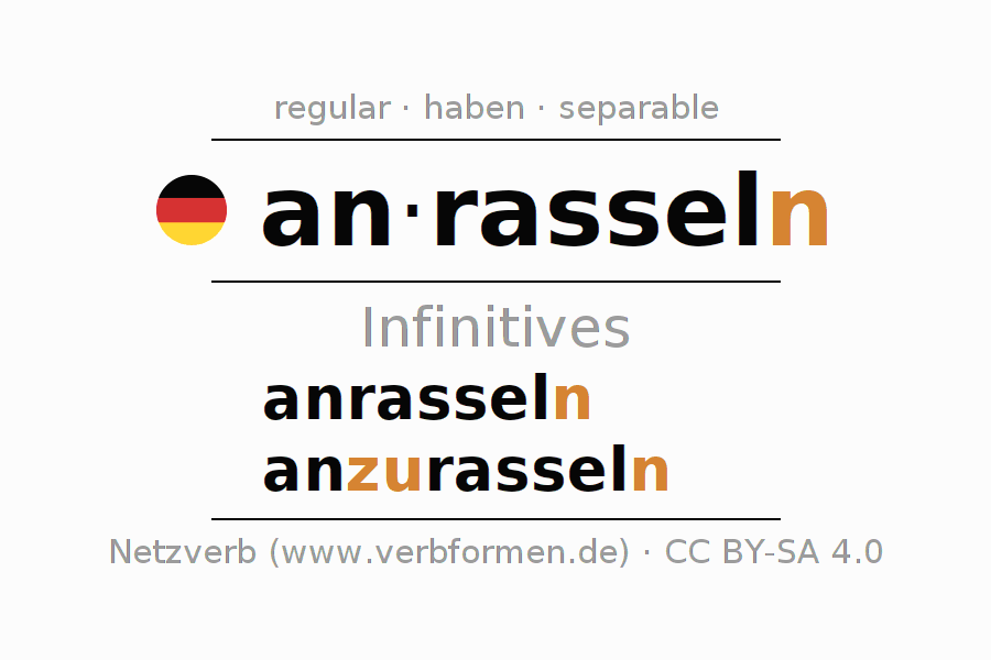 The infinitives of anrasseln are: anrasseln, anzurasseln. The ending -n, shortened by an "e", is appended to the verb stem rassel, since the stem ends with -el. When forming the infinitive with zu the "zu" is inserted after the separable first part an-. The formation of the forms corresponds to the grammatical rules for the conjugation of verbs in the infinitive. Comments ☆