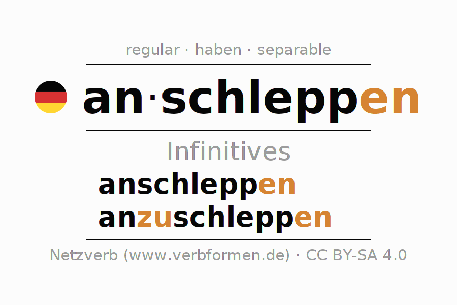 The infinitives of anschleppen (bring along, drag) are: anschleppen, anzuschleppen. The ending -en is appended to the verb stem schlepp. When forming the infinitive with zu the "zu" is inserted after the separable first part an-. The formation of the forms corresponds to the grammatical rules for the conjugation of verbs in the infinitive. Comments ☆