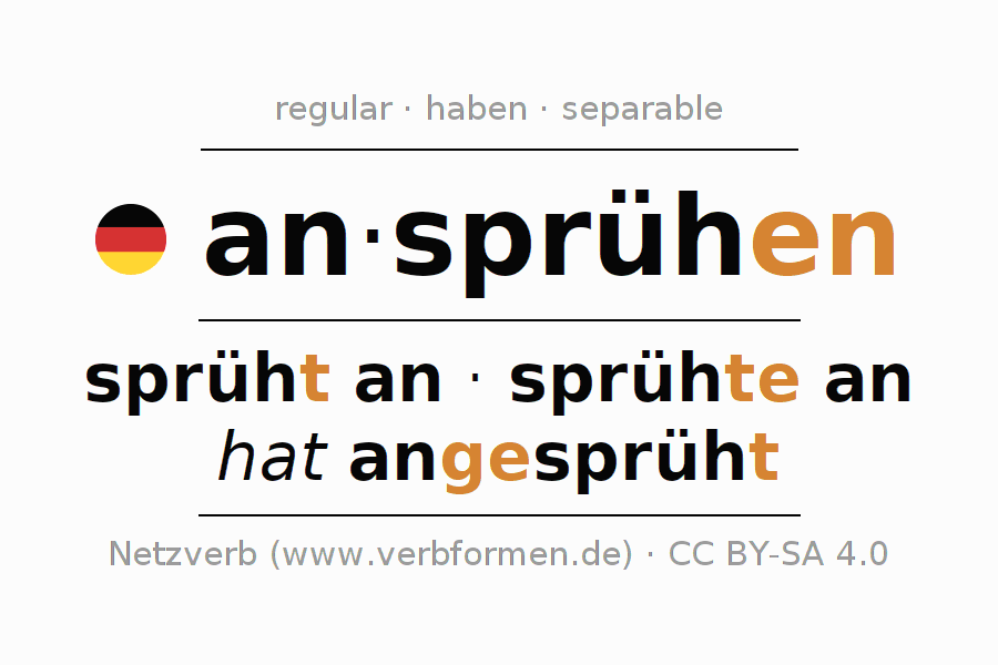 The verb ansprühen fully conjugated in all persons and numbers in the Infinitive Present Perfect