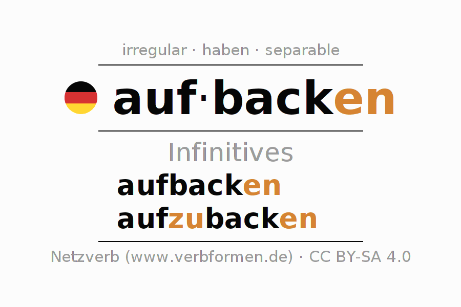 The infinitives of aufbacken (reheat, bake again) are: aufbacken, aufzubacken. The ending -en is appended to the verb stem back. When forming the infinitive with zu the "zu" is inserted after the separable first part auf-. The formation of the forms corresponds to the grammatical rules for the conjugation of verbs in the infinitive. Comments ☆