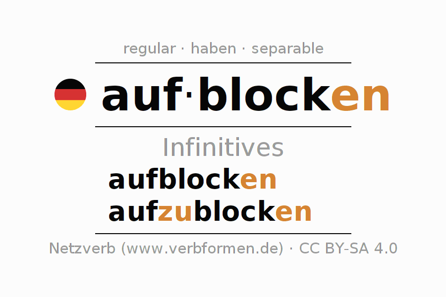 The infinitives of aufblocken (block) are: aufblocken, aufzublocken. The ending -en is appended to the verb stem block. When forming the infinitive with zu the "zu" is inserted after the separable first part auf-. The formation of the forms corresponds to the grammatical rules for the conjugation of verbs in the infinitive. Comments ☆