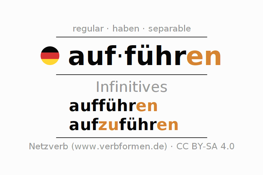 The infinitives of aufführen (perform, list) are: aufführen, aufzuführen. The ending -en is appended to the verb stem führ. When forming the infinitive with zu the "zu" is inserted after the separable first part auf-. The formation of the forms corresponds to the grammatical rules for the conjugation of verbs in the infinitive. Comments ☆