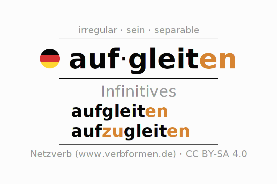 The infinitives of aufgleiten (glide, slip over) are: aufgleiten, aufzugleiten. The ending -en is appended to the verb stem gleit. When forming the infinitive with zu the "zu" is inserted after the separable first part auf-. The formation of the forms corresponds to the grammatical rules for the conjugation of verbs in the infinitive. Comments ☆