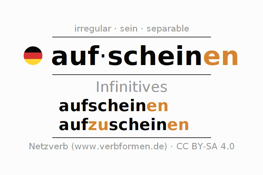 The infinitives of aufscheinen (appear, become bright) are: aufscheinen, aufzuscheinen. The ending -en is appended to the verb stem schein. When forming the infinitive with zu the "zu" is inserted after the separable first part auf-. The formation of the forms corresponds to the grammatical rules for the conjugation of verbs in the infinitive. Comments ☆