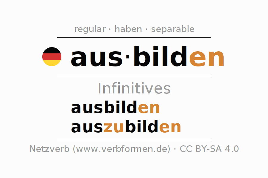 The infinitives of ausbilden (educate, train) are: ausbilden, auszubilden. The ending -en is appended to the verb stem bild. When forming the infinitive with zu the "zu" is inserted after the separable first part aus-. The formation of the forms corresponds to the grammatical rules for the conjugation of verbs in the infinitive. Comments ☆