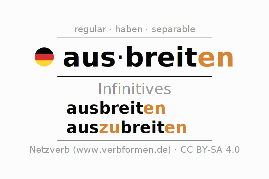 The infinitives of ausbreiten (spread, spread out) are: ausbreiten, auszubreiten. The ending -en is appended to the verb stem breit. When forming the infinitive with zu the "zu" is inserted after the separable first part aus-. The formation of the forms corresponds to the grammatical rules for the conjugation of verbs in the infinitive. Comments ☆