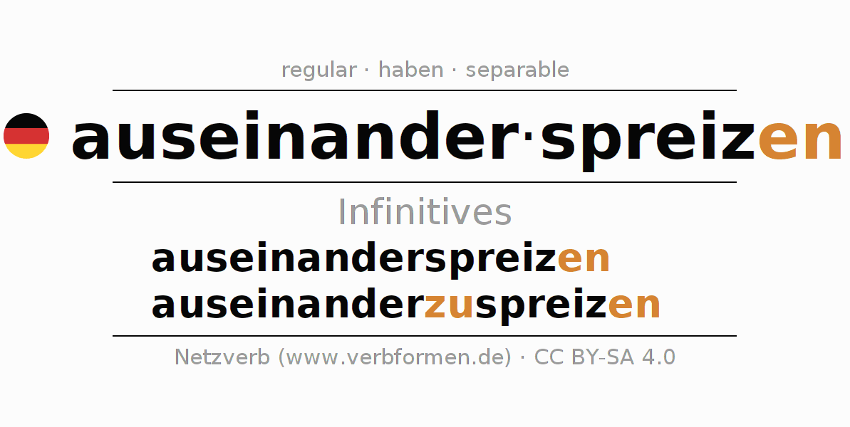 The infinitives of auseinanderspreizen (spread apart, open) are: auseinanderspreizen, auseinanderzuspreizen. The ending -en is appended to the verb stem spreiz. When forming the infinitive with zu the "zu" is inserted after the separable first part auseinander-. The formation of the forms corresponds to the grammatical rules for the conjugation of verbs in the infinitive. Comments ☆
