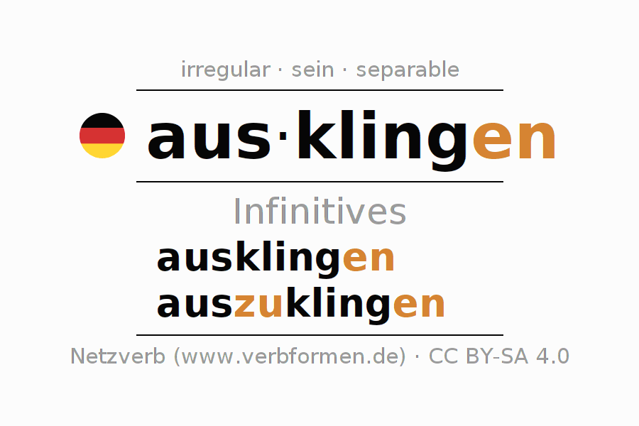 The infinitives of ausklingen (die away, conclude harmoniously) are: ausklingen, auszuklingen. The ending -en is appended to the verb stem kling. When forming the infinitive with zu the "zu" is inserted after the separable first part aus-. The formation of the forms corresponds to the grammatical rules for the conjugation of verbs in the infinitive. Comments ☆