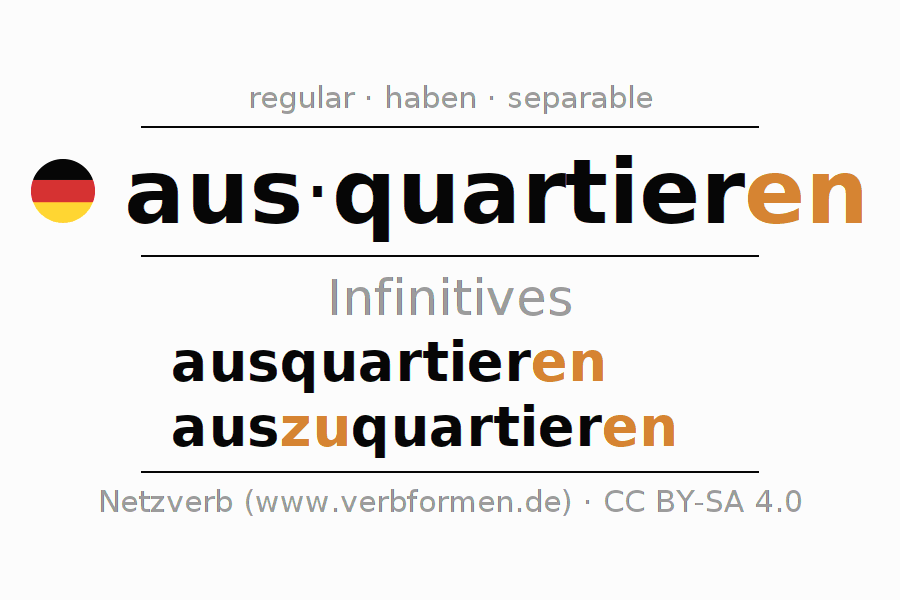 The infinitives of ausquartieren (billet out, dislodge) are: ausquartieren, auszuquartieren. The ending -en is appended to the verb stem quartier. When forming the infinitive with zu the "zu" is inserted after the separable first part aus-. The formation of the forms corresponds to the grammatical rules for the conjugation of verbs in the infinitive. Comments ☆