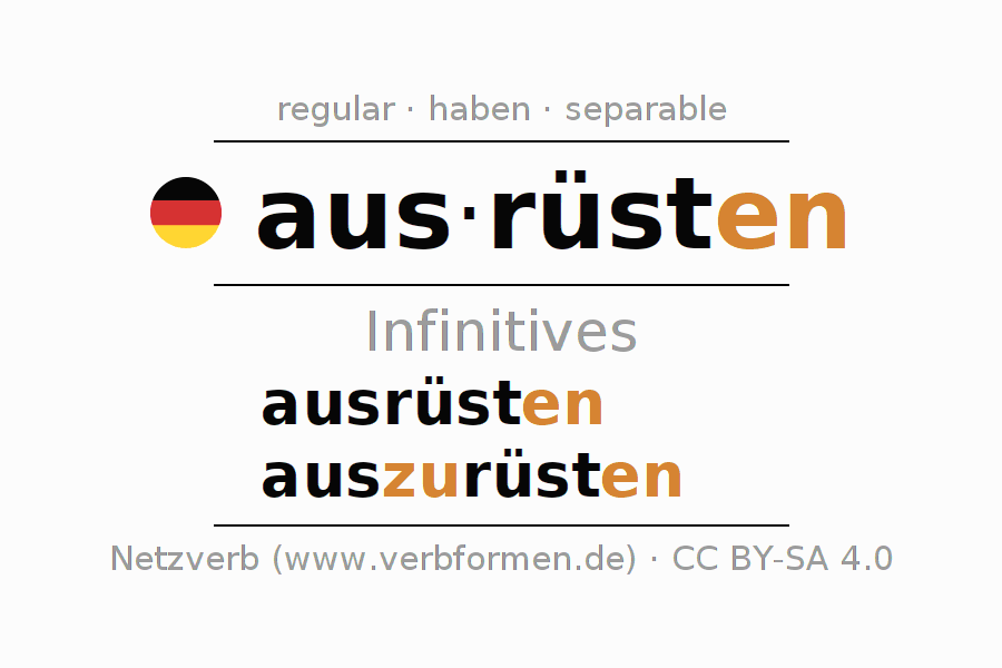 The infinitives of ausrüsten (equip, furnish) are: ausrüsten, auszurüsten. The ending -en is appended to the verb stem rüst. When forming the infinitive with zu the "zu" is inserted after the separable first part aus-. The formation of the forms corresponds to the grammatical rules for the conjugation of verbs in the infinitive. Comments ☆