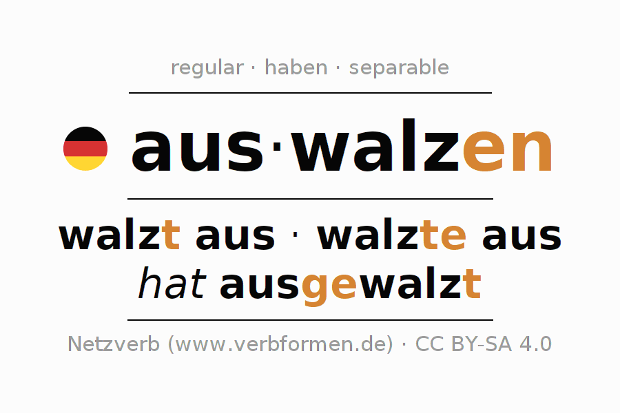 The verb auswalzen fully conjugated in all persons and numbers in the Infinitive Present Perfect