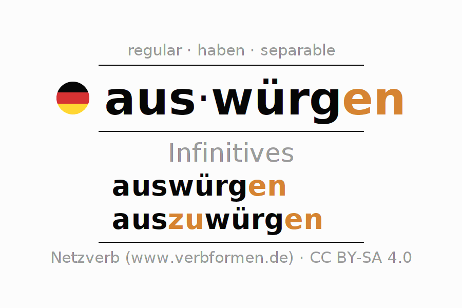 The infinitives of auswürgen (regurgitate, vomit) are: auswürgen, auszuwürgen. The ending -en is appended to the verb stem würg. When forming the infinitive with zu the "zu" is inserted after the separable first part aus-. The formation of the forms corresponds to the grammatical rules for the conjugation of verbs in the infinitive. Comments ☆