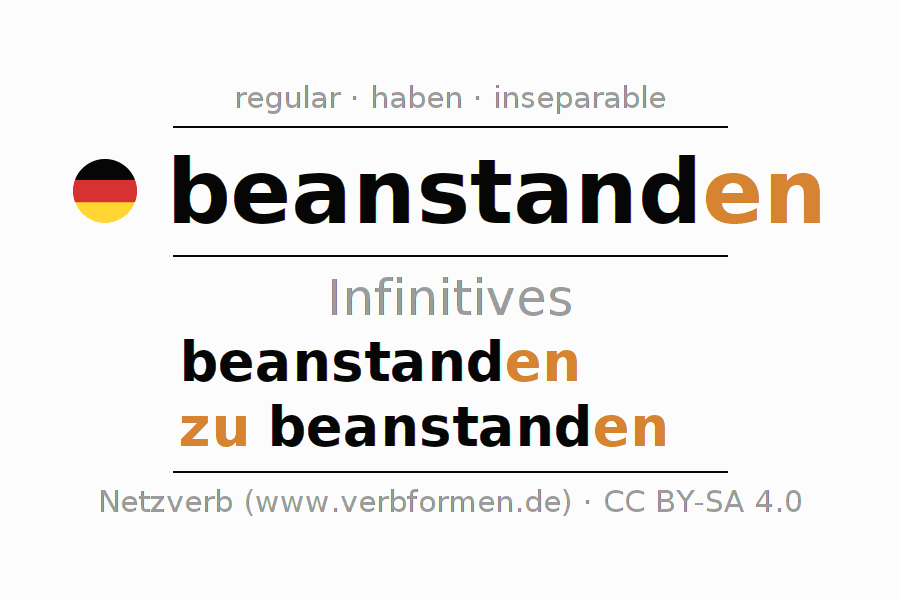 The infinitives of beanstanden (complain about, complain) are: beanstanden, zu beanstanden. The ending -en is appended to the verb stem stand. When forming the infinitive with zu, the "zu" is prepended to the verb, since it has no separable first parts. The formation of the forms corresponds to the grammatical rules for the conjugation of verbs in the infinitive. 1Comment ☆