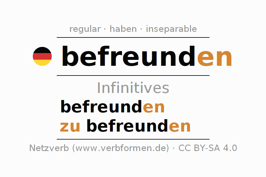 The infinitives of befreunden (befriend, make friends) are: befreunden, zu befreunden. The ending -en is appended to the verb stem freund. When forming the infinitive with zu, the "zu" is prepended to the verb, since it has no separable first parts. The formation of the forms corresponds to the grammatical rules for the conjugation of verbs in the infinitive. Comments ☆