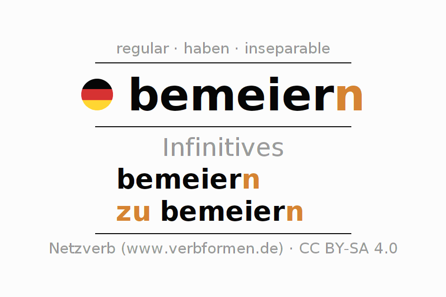 The verb bemeiern fully conjugated in all persons and numbers in the Infinitive Present Perfect